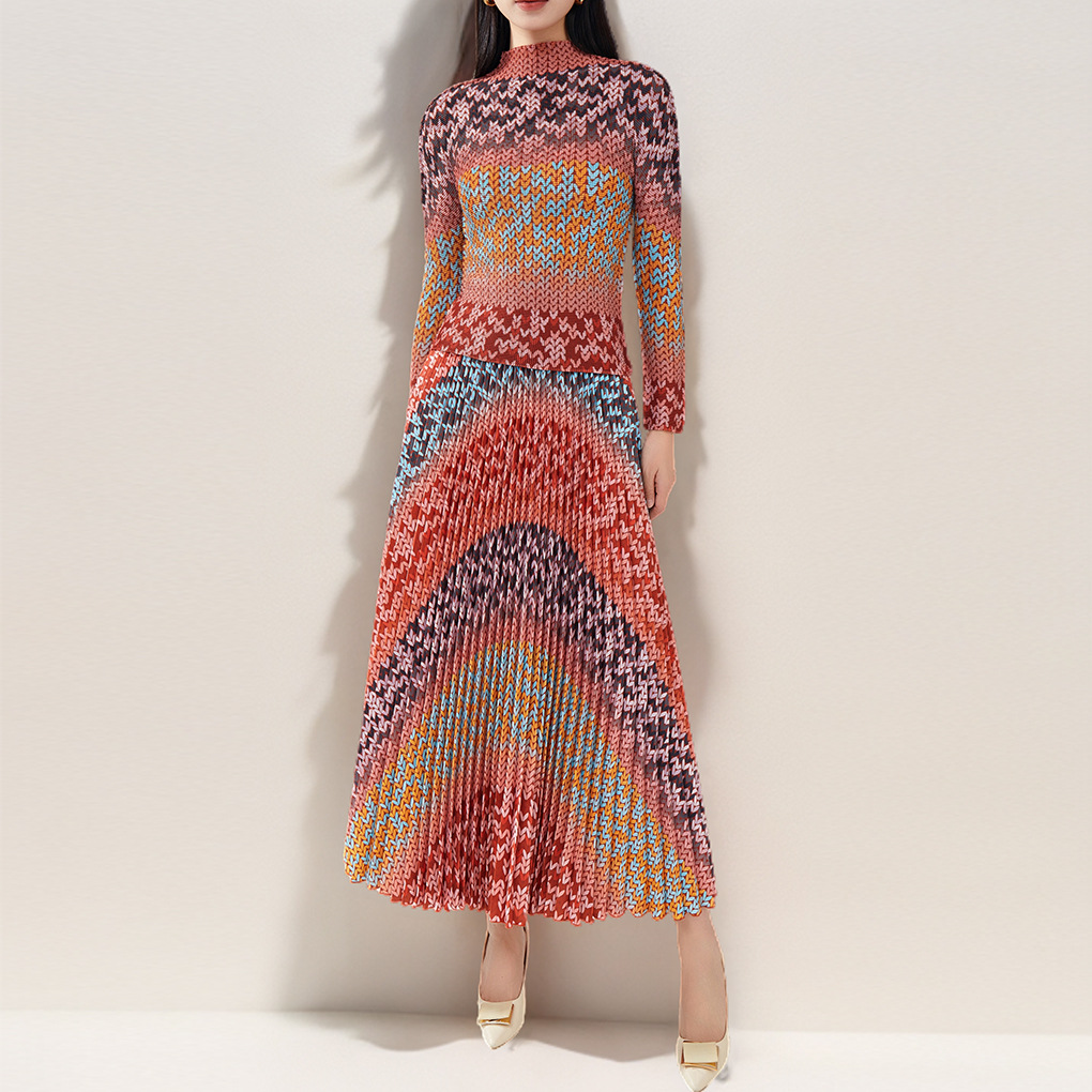 Rok lipit gaya Barat elegan, pakaian dua potong wanita usia sedang dan lansia, rok lipit elegan mengurangi usia, pakaian ibu musim gugur