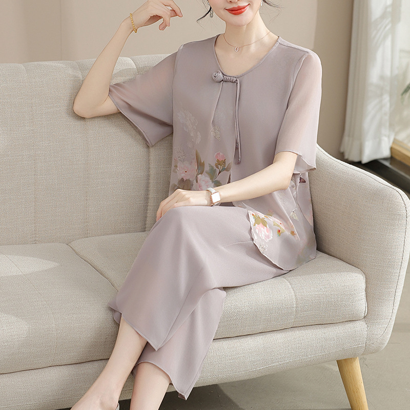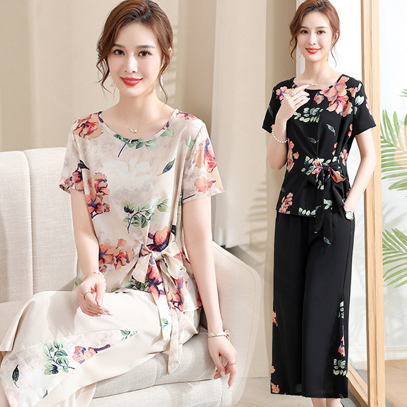 Set Sifon Model Baru Musim Panas Ibu Lengan Pendek Gaya Barat Modis Ukuran Besar Set Dua Potong Gaya Tiongkok Baru Setengah Baya