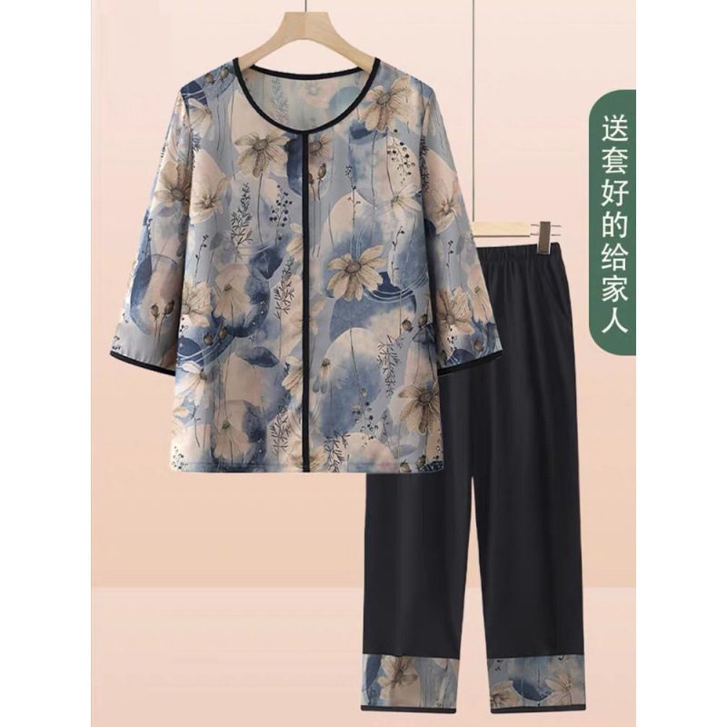 Pakaian ibu musim panas, setelan sutra es, pakaian wanita paruh baya dan lansia, ukuran besar lengan pendek, piyama dua potong, penjualan langsung pabrik Yiwu