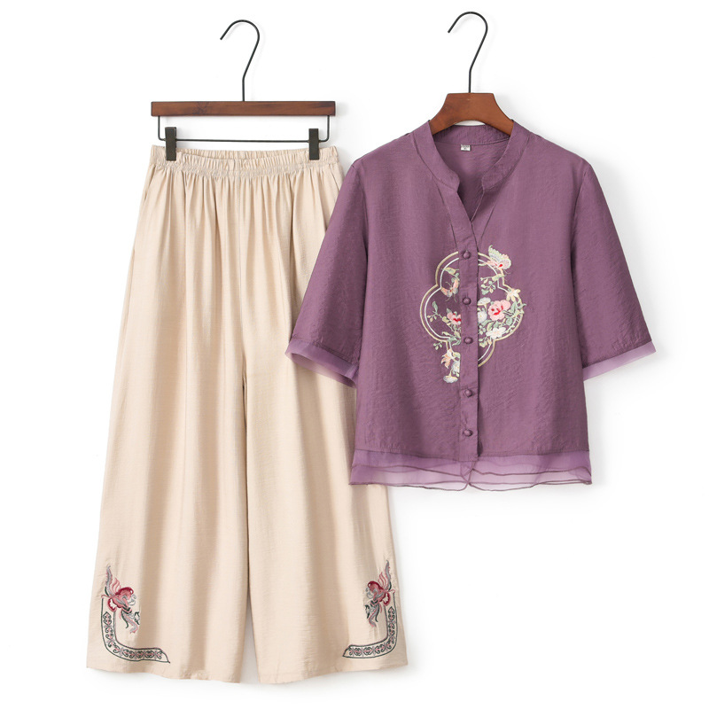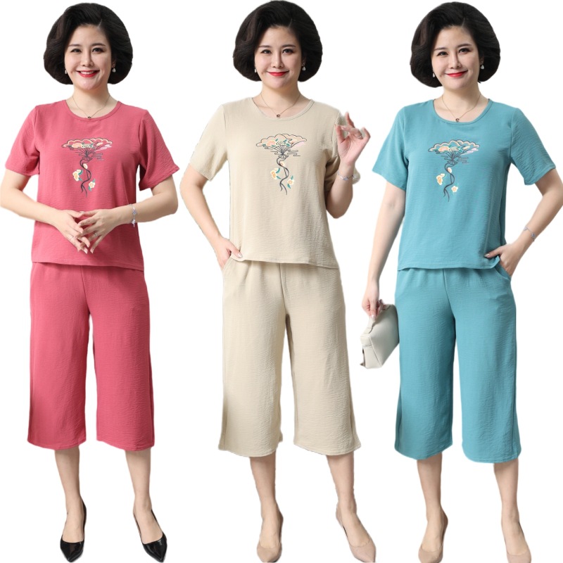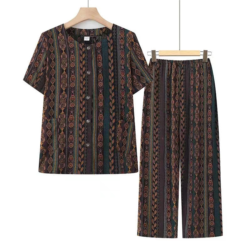 Setelan Sutra Es Lengan Pendek Musim Panas Ibu Pakaian Wanita Setengah Baya dan Wanita Usia Lanjut