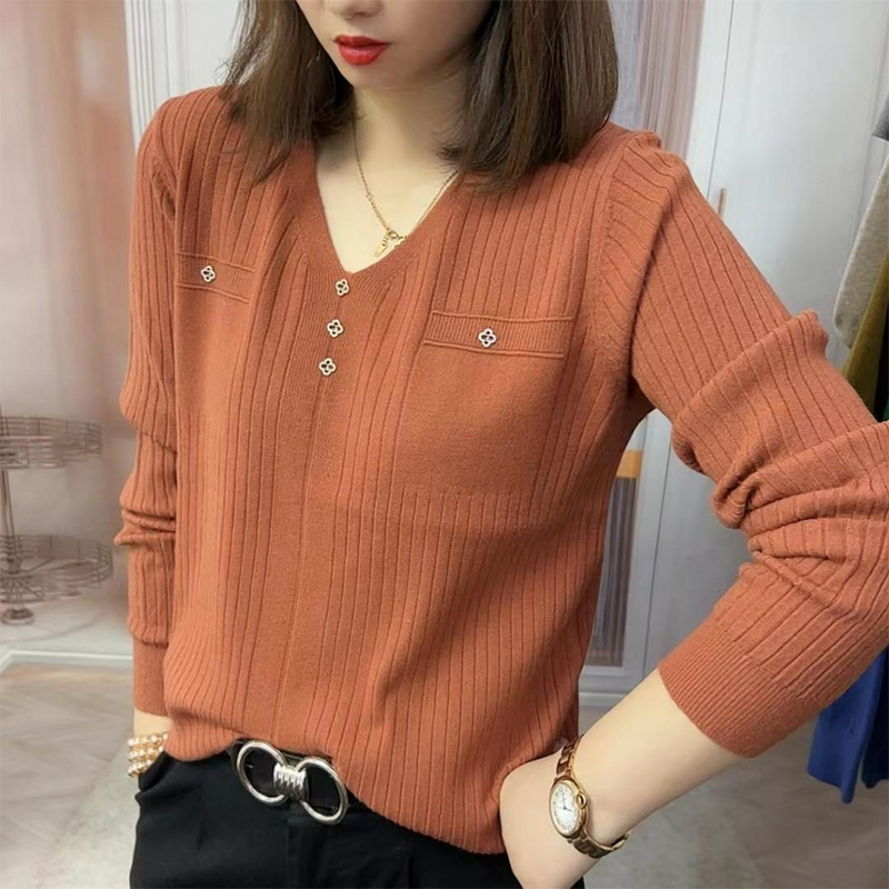 Sweater rajut leher V warna polos untuk wanita, jaket pullover lengan panjang longgar leher V untuk ibu usia sedang musim semi 2024