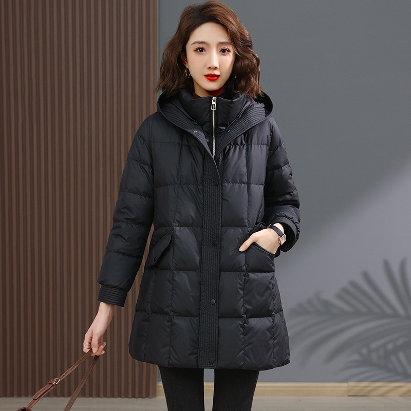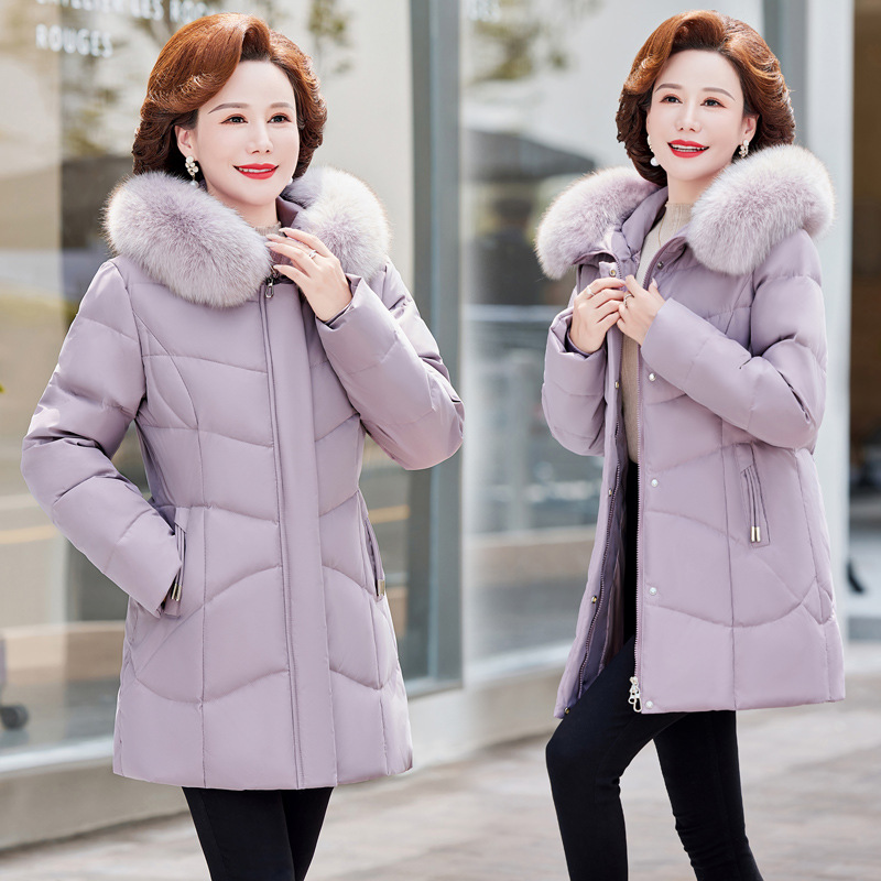 Jaket bulu angsa wanita panjang sedang, elegan gaya Eropa terbaru 2024 yang ringan dan modis, mantel musim dingin yang stylish untuk ibu, pakaian luar yang menurunkan usia.