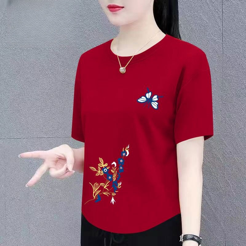 酒红色夏季短袖宽松大码韩版妈妈装新款印花宽松显瘦女装体恤上衣