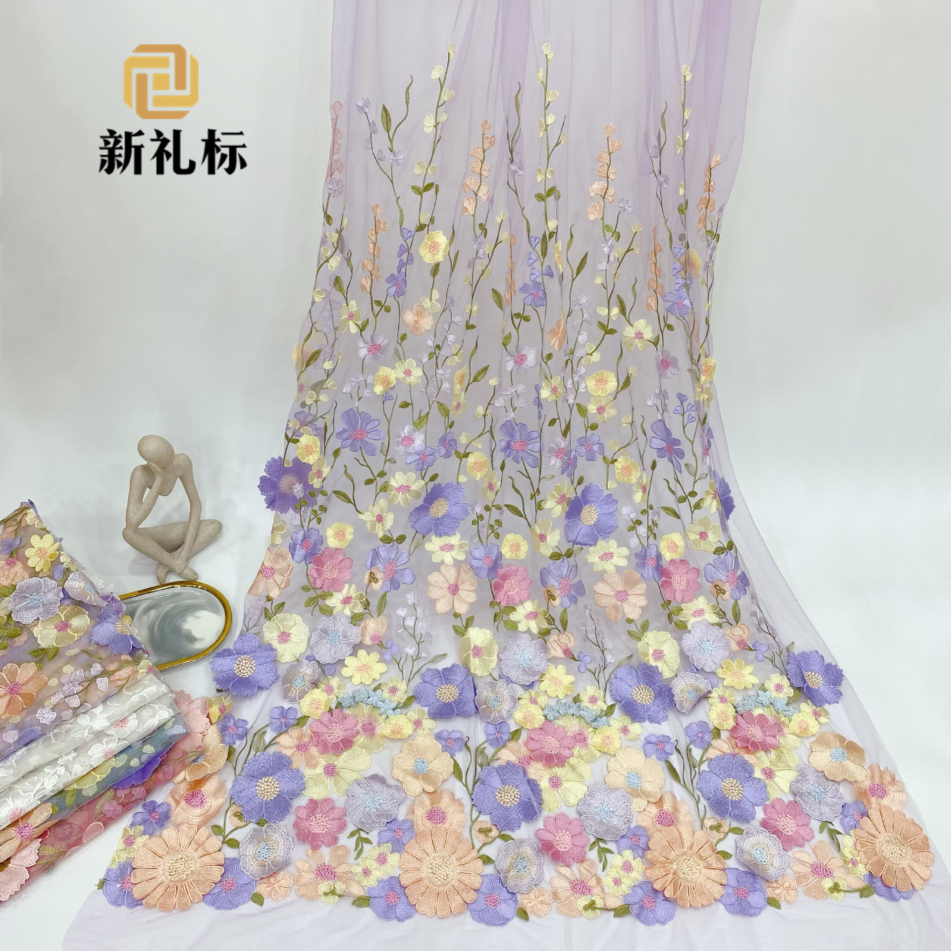 Panel tiga-dalam-satu berbahan sutra kerut dengan bordir renda, bordir kait, bordir tabung manik-manik, bordir tali, bordir datar, kain katun sutra susu dengan desain berlubang dan jaring tersembunyi.