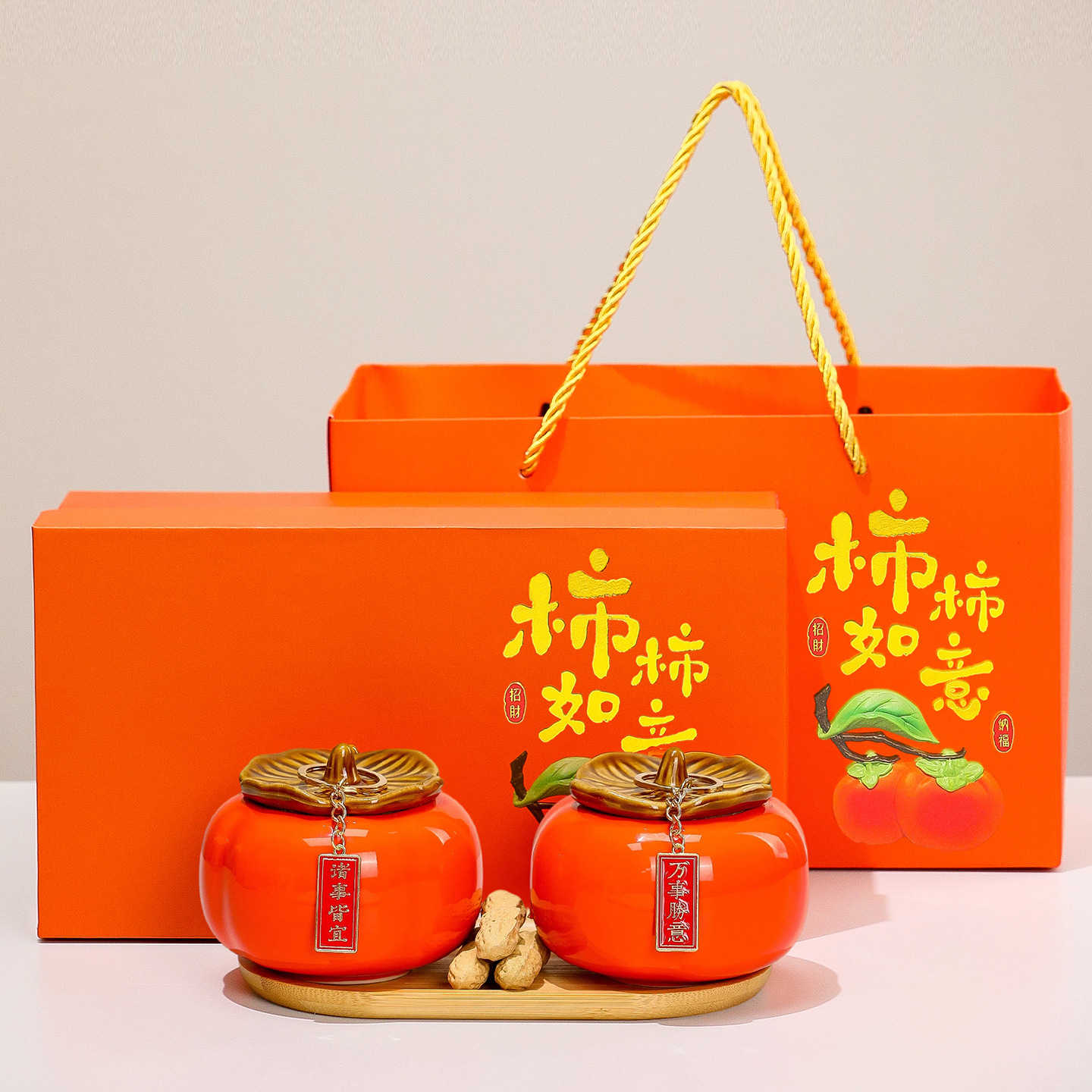 高档礼品柿柿如意陶瓷柿子礼盒装茶叶罐婚庆礼品烟灰缸乔迁送礼物