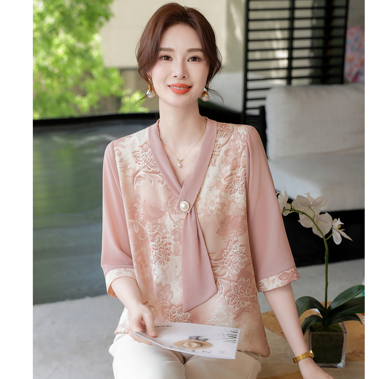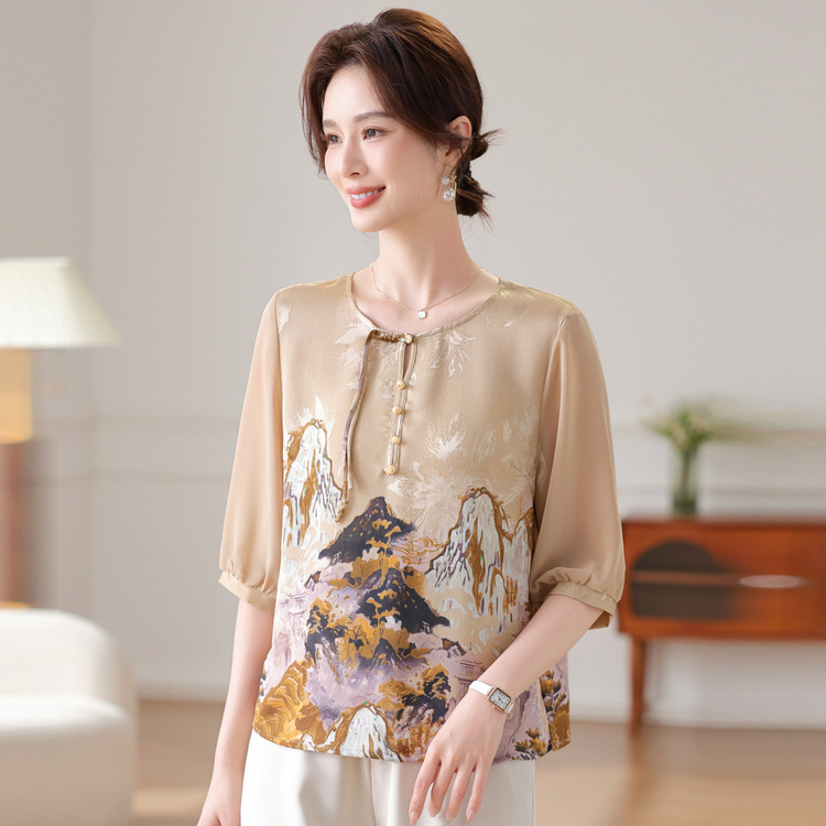 Nenek musim semi dan musim panas gaya cina lengan pendek ibu kecil musim panas sifon temperamen Tang setelan paruh baya dan tua T-shirt kemeja kecil