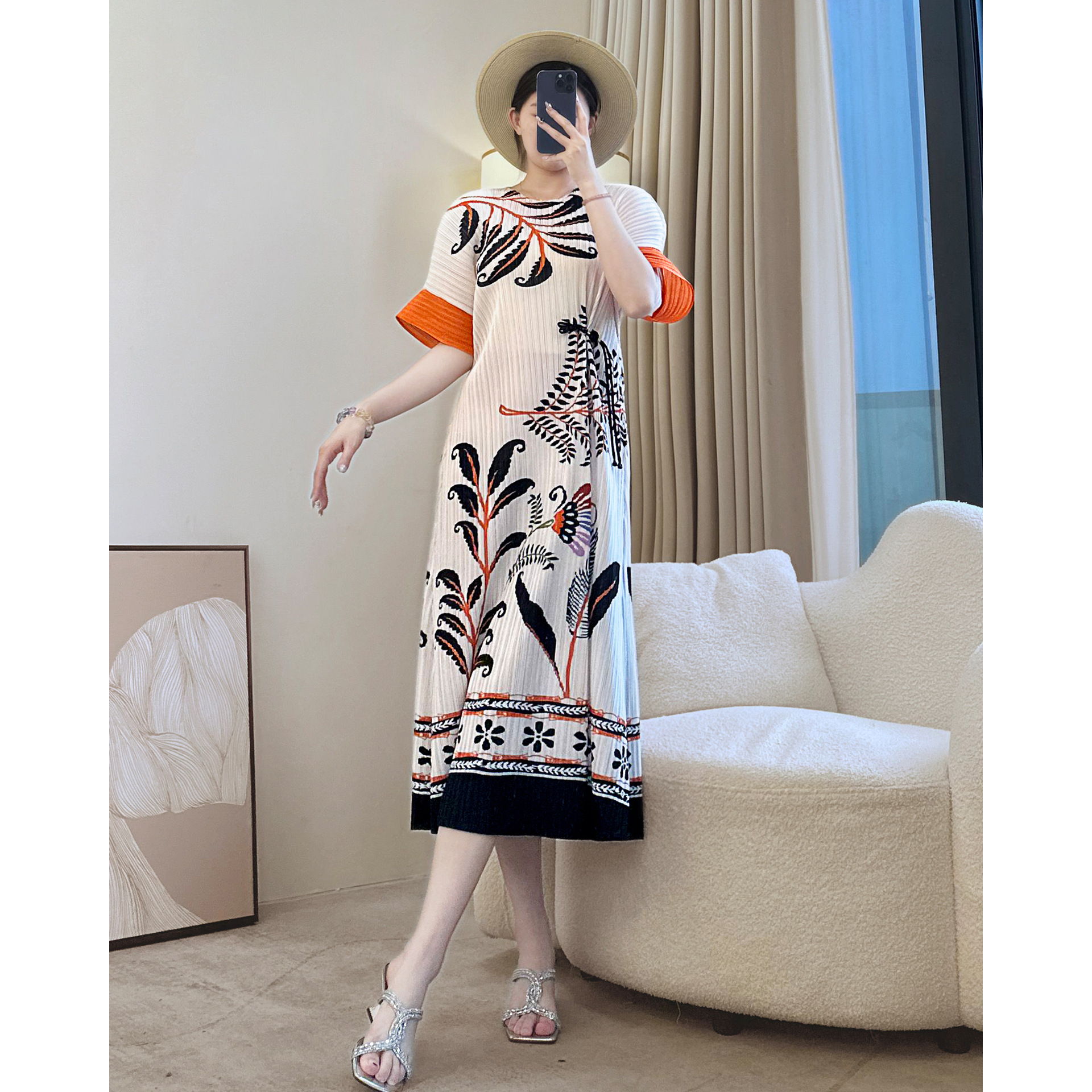 Miyake Rok Panjang Lipit Desain Longgar Sosialita Kelas Atas Elegan Warna Kombinasi Musim Panas Gaun Terlihat Kurus Pinggang Tinggi Ibu