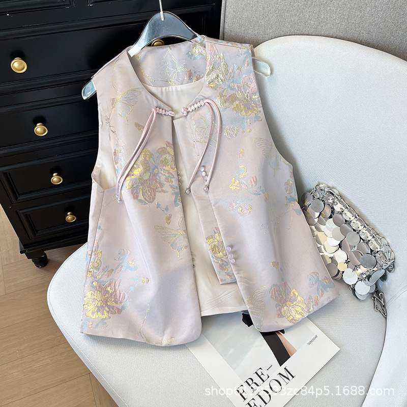 Rompi Gaya Tiongkok Baru Tank-top Kecil Muda Model Tipis Warna Merah Muda Tiga Dimensi Kancing Kancing Jacquard Jaket Modis Ibu Setengah Baya