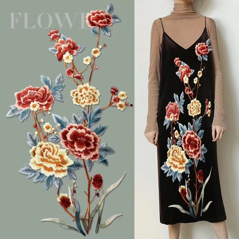 Bunga peony besar larut dalam air bordir kain stiker rok cheongsam pakaian anak-anak aksesoris poliester sutra bordir bunga grosir