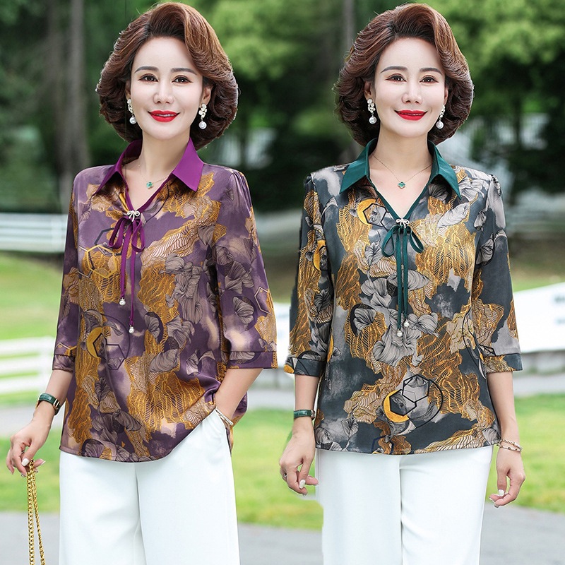 中年妈妈夏装气质显瘦遮肚仿真丝上衣中年女装时尚五分袖宽松衬衫