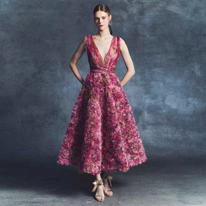 2025亚马逊跨境新品印花层叠荷叶边礼服欧美春夏女装中长款连衣裙