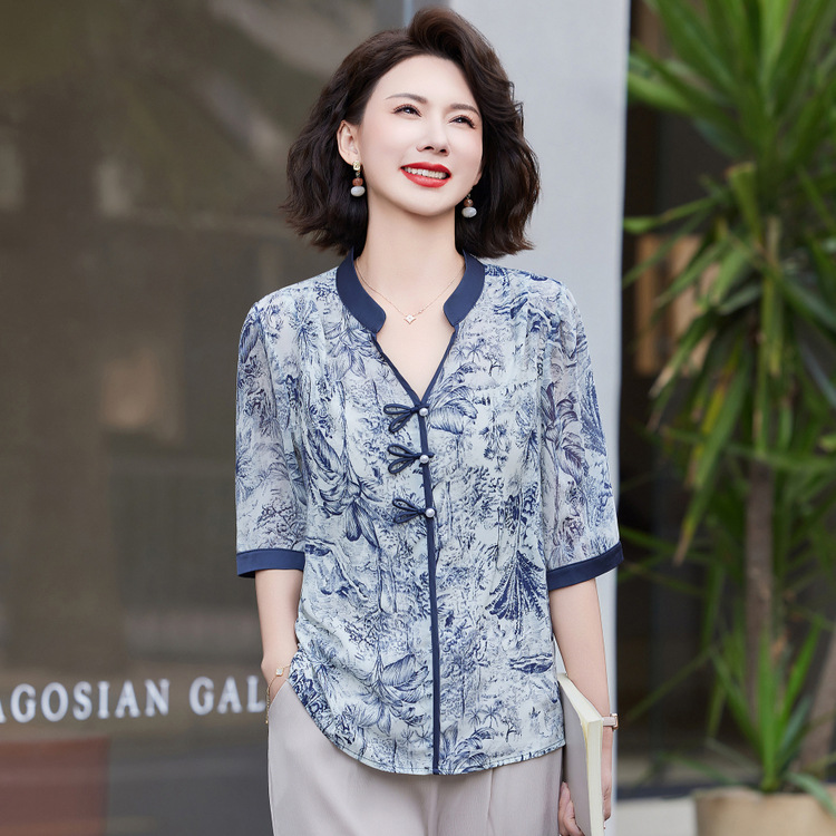 Kaus sifon elegan ibu dan lansia, atasan lengan pendek musim panas modis kecil 2022