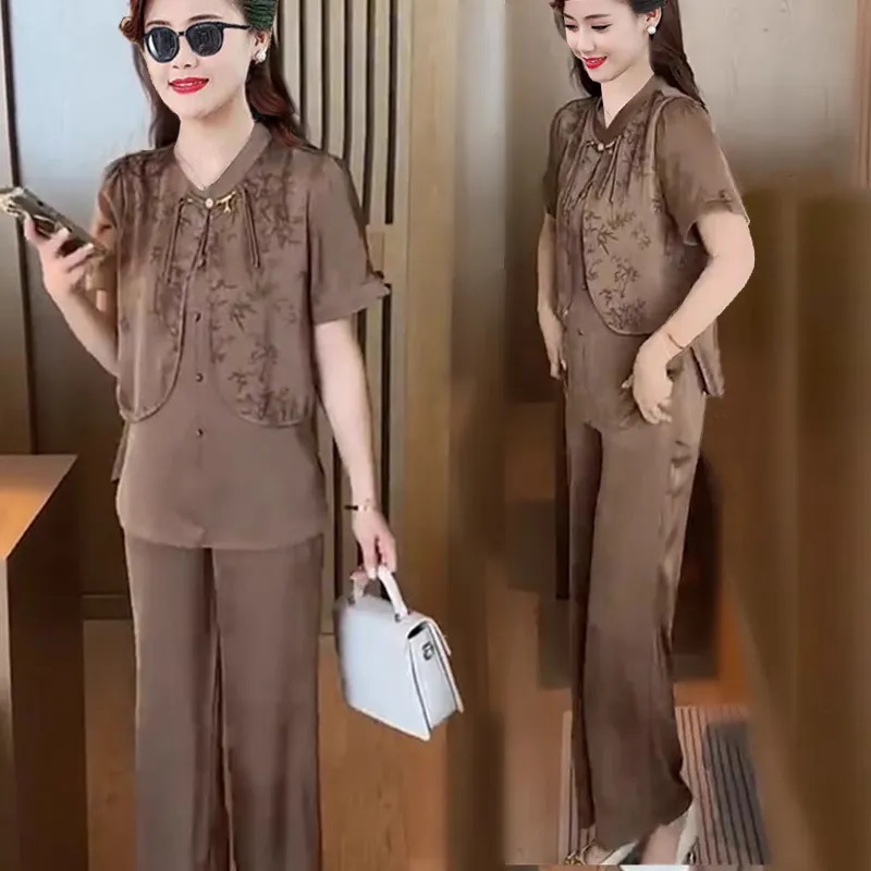 Setelan Pakaian Ibu Terlihat Kurus Mengurangi Usia Model Tipis Musim Panas Setelan Dua Potong Kemeja Kecil Modis Gaya Cina Setengah Baya dan Tua Rok Celana Longgar Trendi