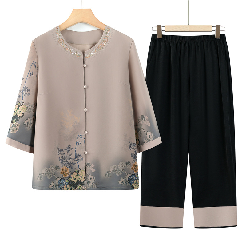 Pakaian musim panas ibu, setelan dua potong wanita paruh baya dan lansia, atasan gaya Tiongkok gaya Barat, lengan setengah musim panas untuk ibu