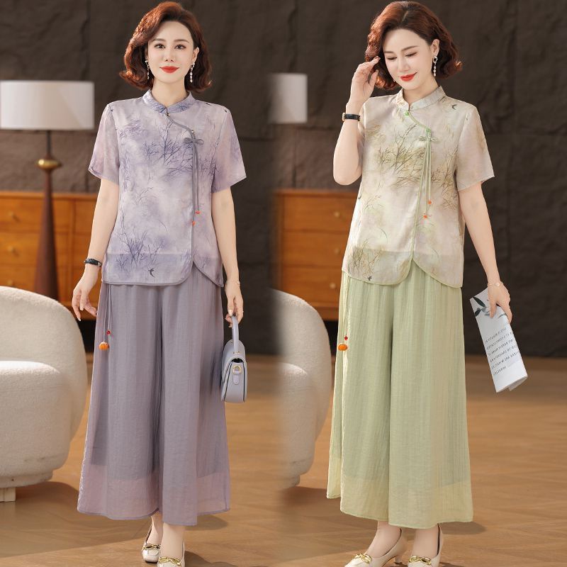 Pakaian Ibu Setengah Baya Gaya Barat Model Baru Musim Panas 2025 Celana Kaki Lebar Modis Set Dua Potong Lengan Pendek Gaya Tiongkok Baru Hari Ibu