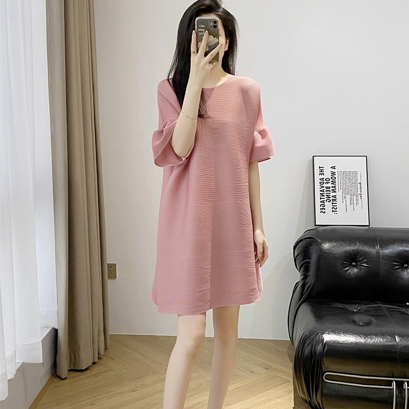 三宅风褶皱连衣裙2024新款藕粉色妈妈装大码女装mm孕妇装时尚气质