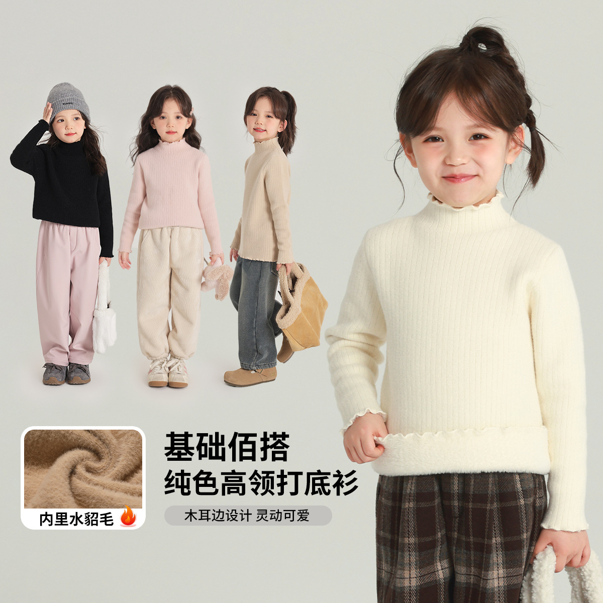 冬装上新女童洋气打底衫2024秋冬季新款儿童百搭纯色木耳边打底衫