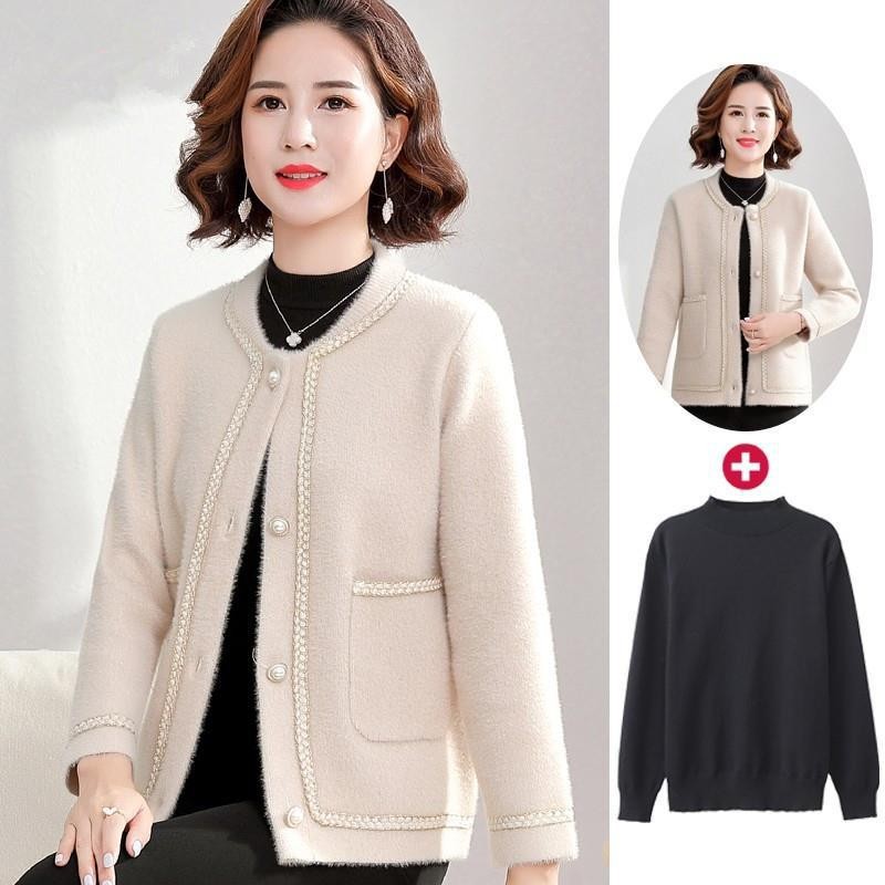 Mantel bulu rajut wanita, atasan hangat kardigan rajutan pendek usia sedang dan orang tua gaya Barat musim gugur dan musim dingin untuk ibu