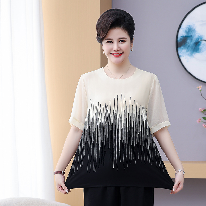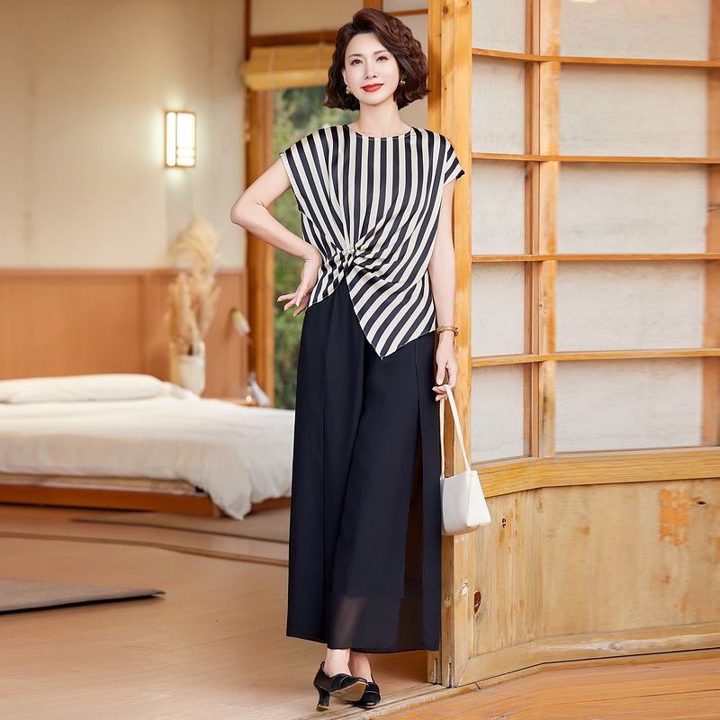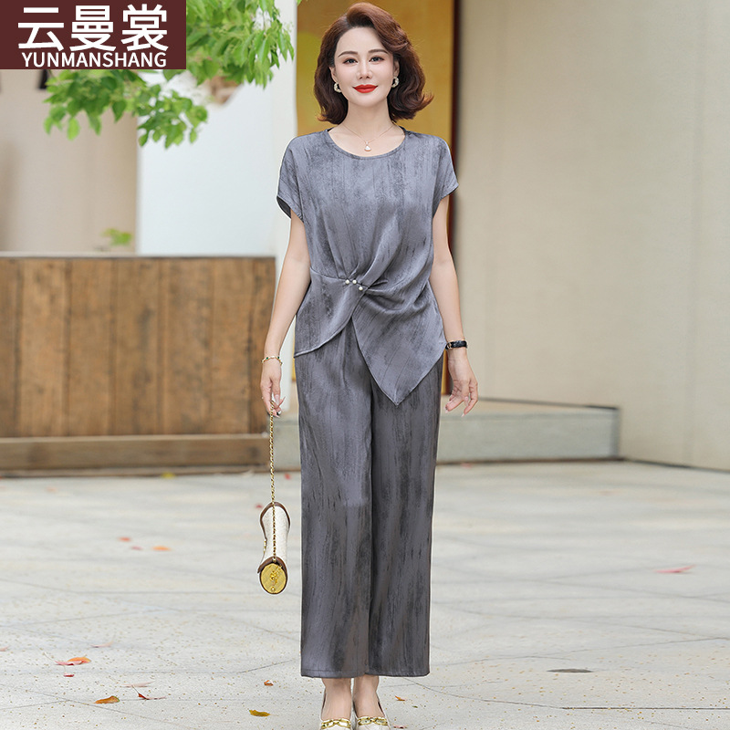 Pakaian Ibu Atasan Lengan Pendek Gaya Barat Model Baru Kasual Modis Musim Panas Pakaian Wanita Paruh Baya Setelan Dua Potong Mengurangi Usia