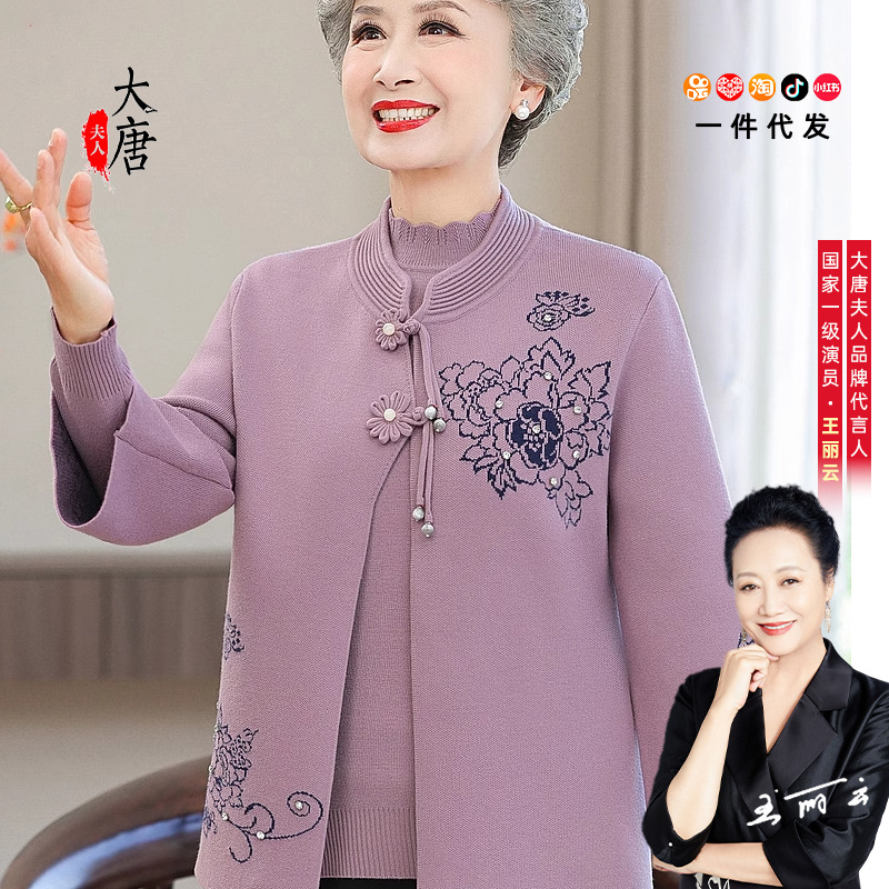 Atasan Rajutan Model Musim Semi dan Musim Panas Pria Paruh Baya dan Wanita Paruh Baya Tahan Dingin Pagi dan Malam Pakaian Orang Tua Setelan Dua Potong Jaket Kerah Tegak Gaya Barat Ibu Wanita