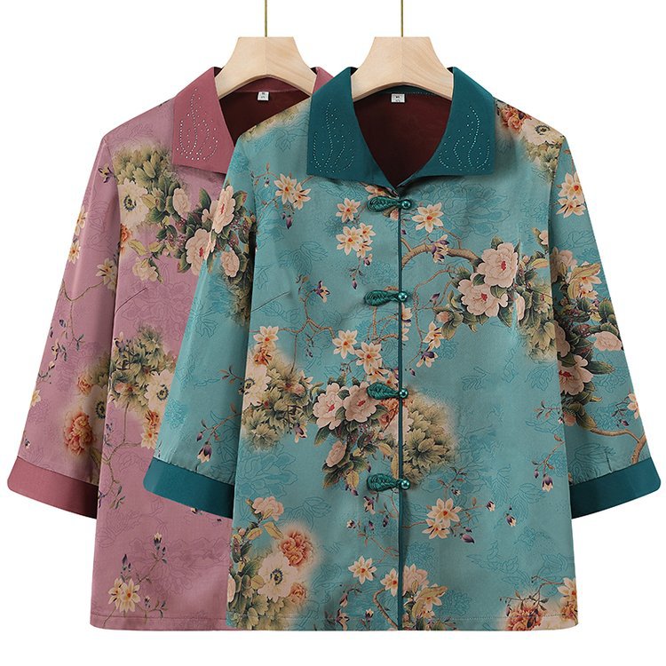 Kaus musim panas nenek usia 60 tahun 70 orang tua gaya Barat kemeja berkerah setelan pakaian wanita tua pakaian ibu wanita ringan