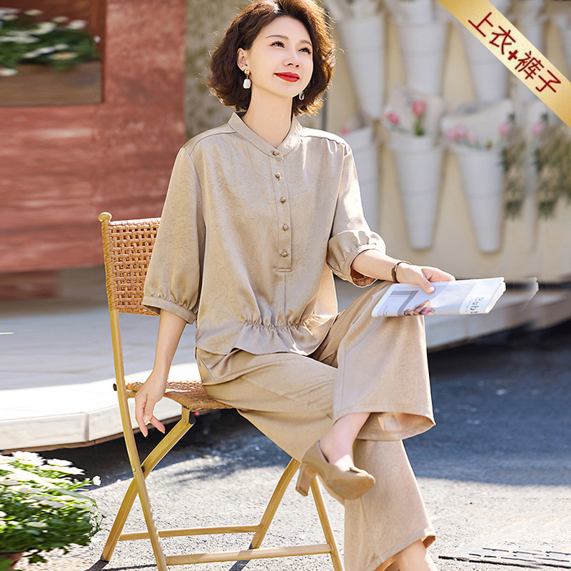 Set Lengan Pendek Ibu Grosir Fisik 2025 Musim Panas Model Baru Pakaian Wanita Paruh Baya Elegan Longgar Set Dua Potong