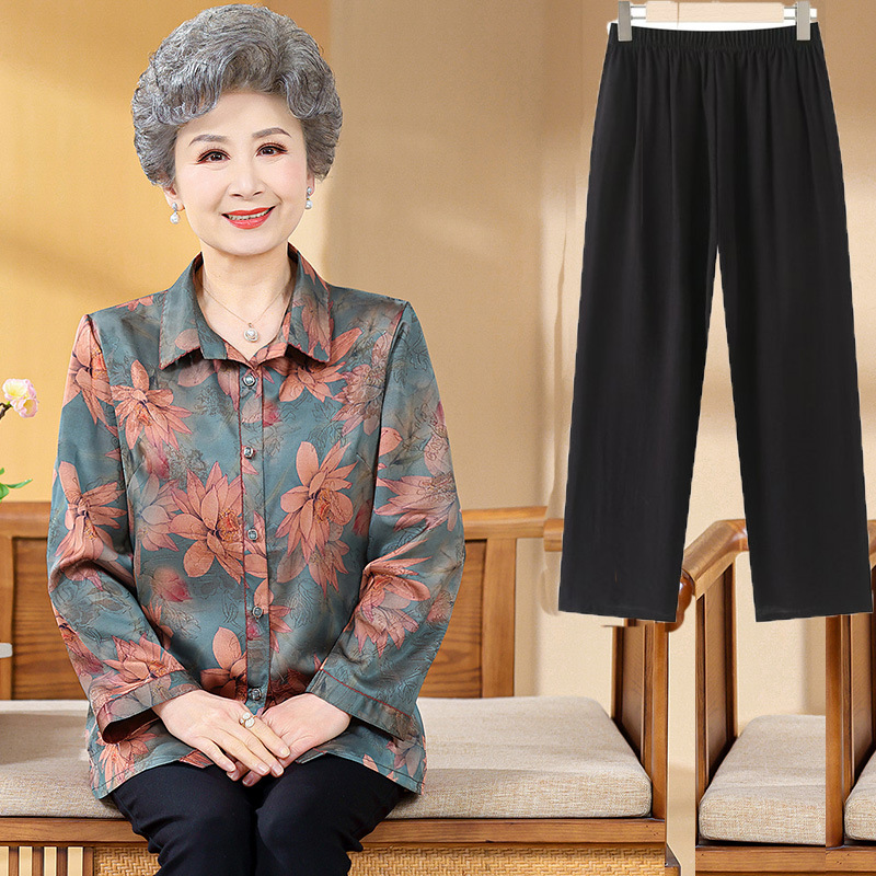 Kemeja tipis musim semi dan musim gugur untuk pakaian ibu wanita tua untuk Nenek setelan lengan panjang wanita tua pakaian gaya Barat untuk orang tua musim panas