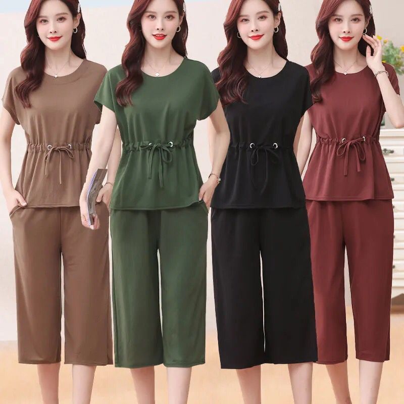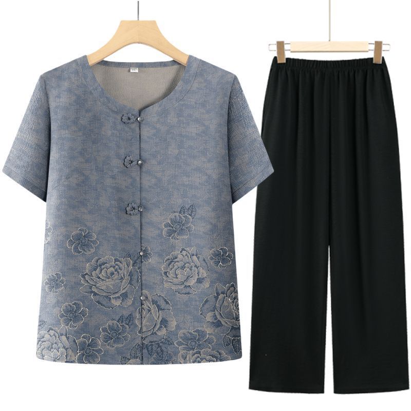 Pakaian Musim Panas Ibu Setengah Baya Kemeja Kecil Lengan Pendek Set Dua Potong Model Baru Atasan Wanita Paruh Baya Model Musim Panas Set Modis Hari Ibu