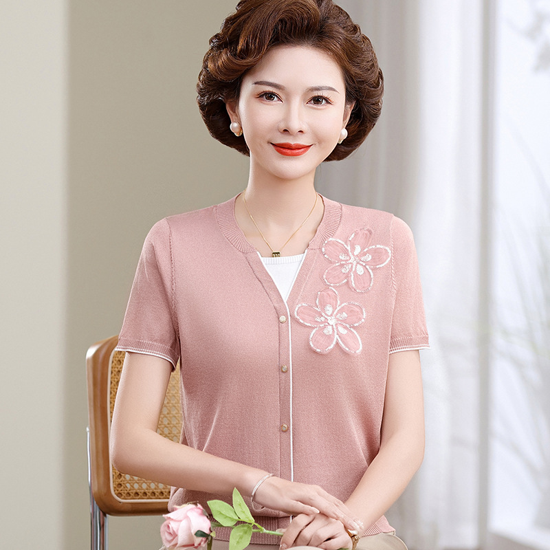 Pakaian Musim Panas Ibu Elegan Atasan Tipis Palsu Dua Potong Atasan Rajutan Longgar T-shirt Lengan Pendek Sutra Es Wanita Paruh Baya