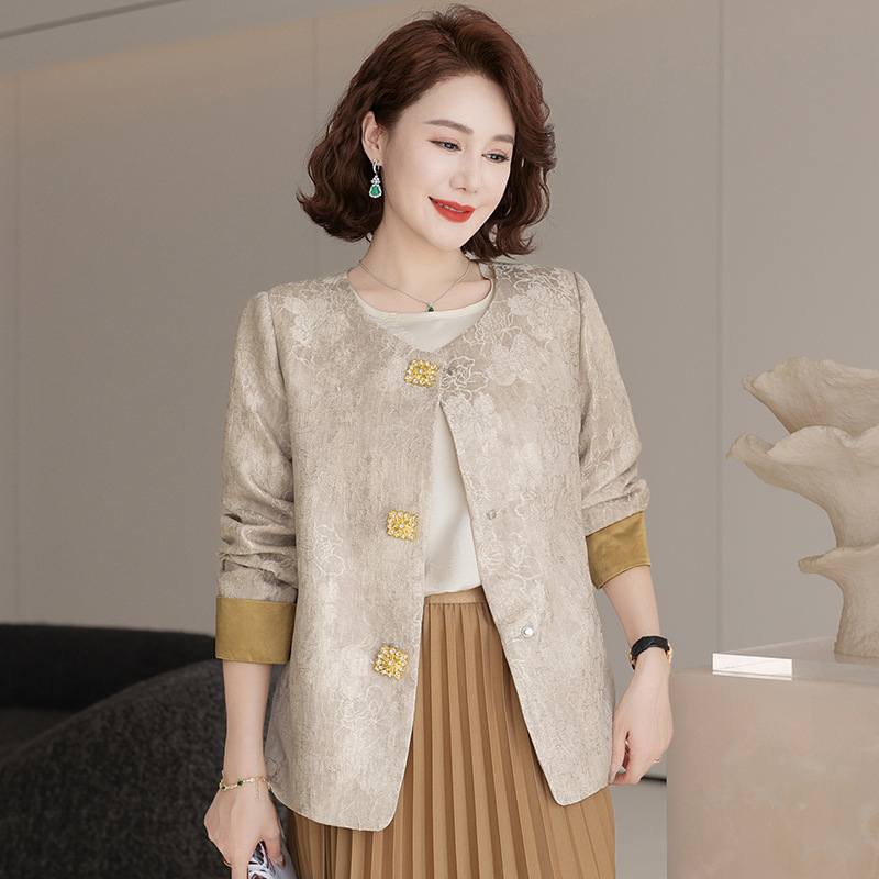 Jaket Jacquard Gaya Cina Baru Musim Semi 2025 Pakaian Ibu Model Baru Atasan Setengah Baya Elegan Mengurangi Usia Sosialita
