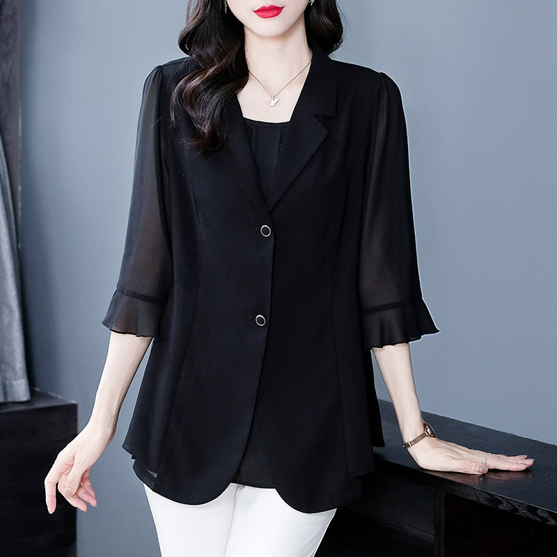 Perancis konter gaya yang sama ukuran besar 240kg musim panas lengan pendek setelan kemeja sifon atasan ibu pakaian wanita usia sedang