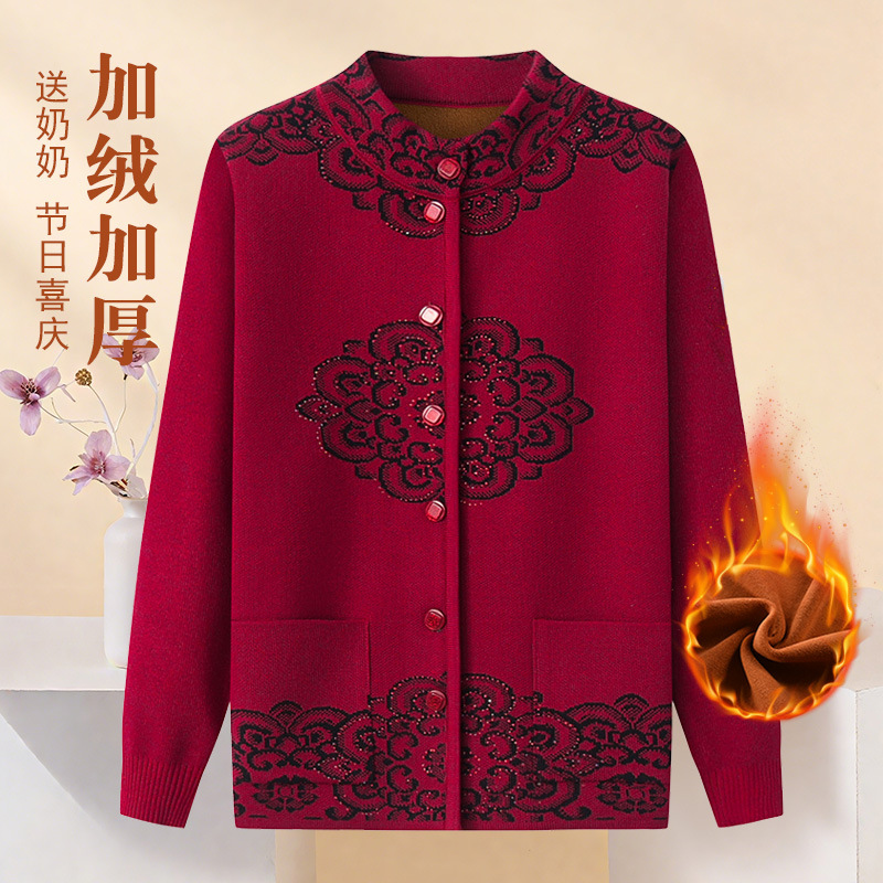 Jaket kardigan musim dingin nenek, kerah kardigan Musim Semi dan musim gugur wanita usia sedang dan orang tua lebar ibu rajutan pakaian tua