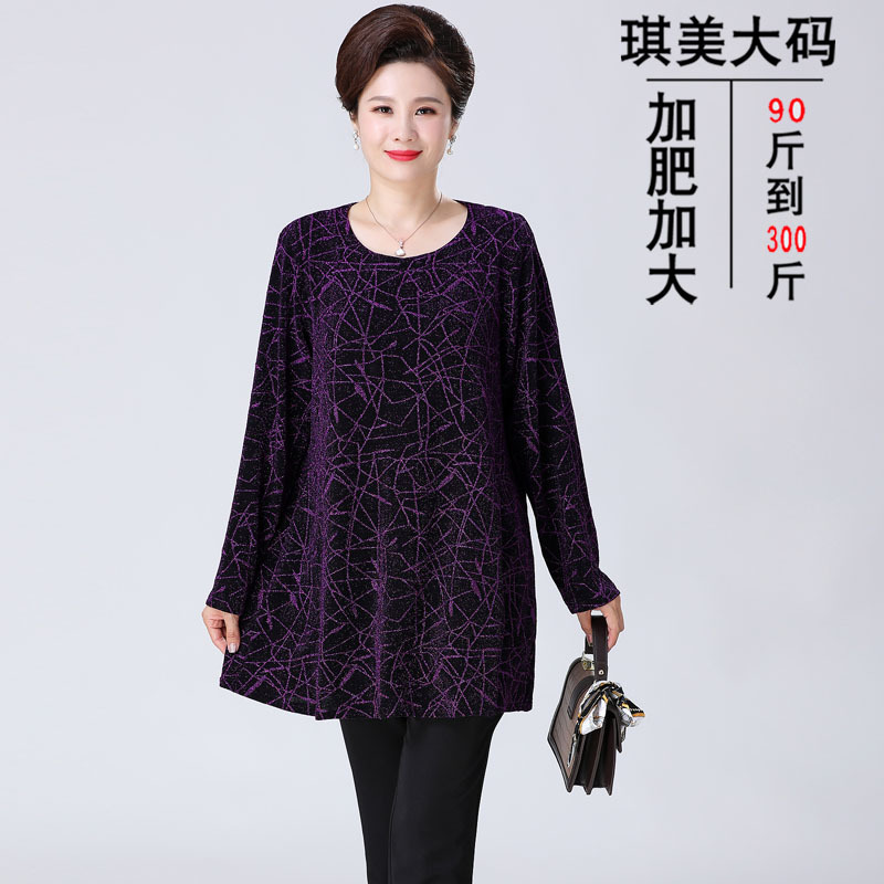 Baju ibu gemuk Musim Semi dan Gugur, baju atasan wanita paruh baya dan lansia, baju ibu ukuran plus lengan panjang leher bulat