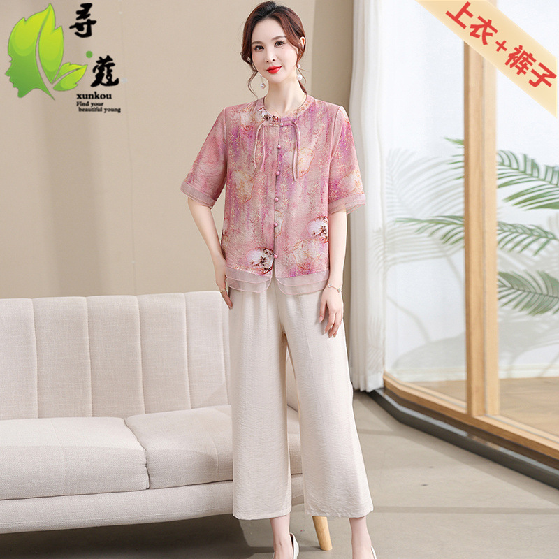 Ibu musim panas palsu kemeja dua potong setengah baya dan orang tua lengan pendek kemeja sifon setelan nenek gaya Barat pakaian musim panas setelan dua potong