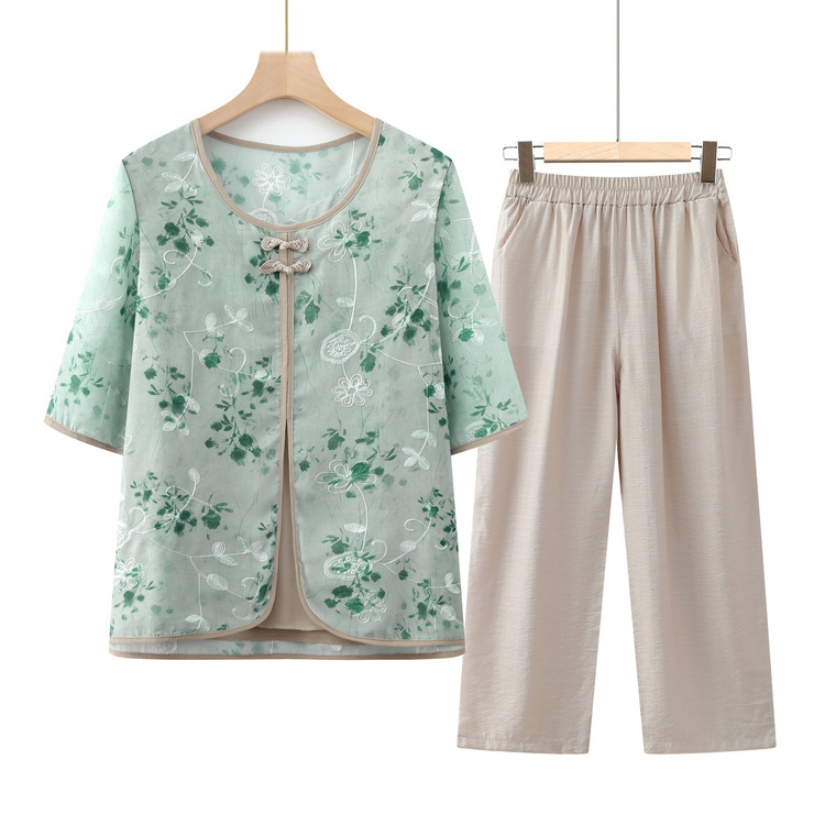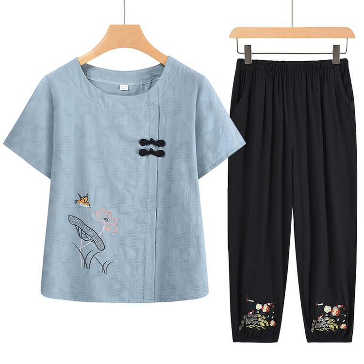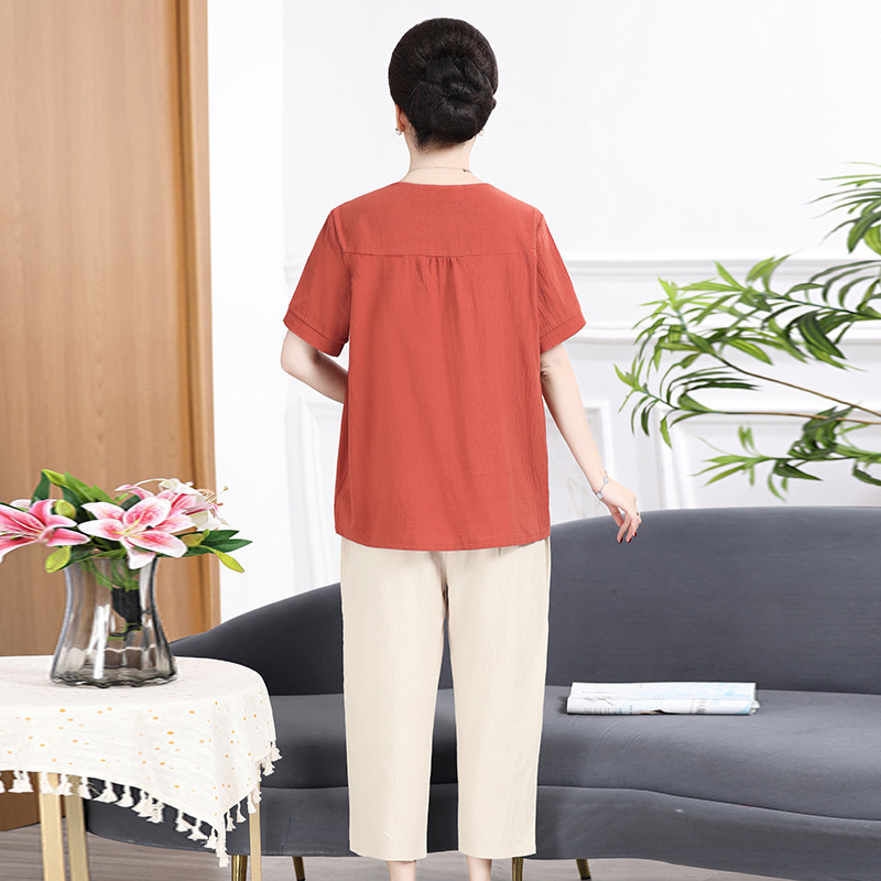 Pakaian Musim Panas Ibu Setelan Kaus Wanita Setengah Baya dan Tua Setelan Kaus Nenek Baju Atasan Ibu mertua Musim Panas Gaya Tiongkok Lengan Pendek