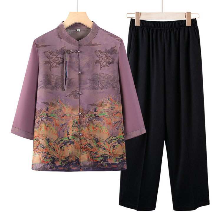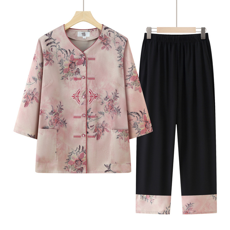 Kemeja Musim Panas Nenek Pakaian Wanita Setengah Baya dan Lansia Setelan Musim Panas Pakaian Orang Tua Baju Atasan Lengan 3/4 Ibu Setelan Dua Potong