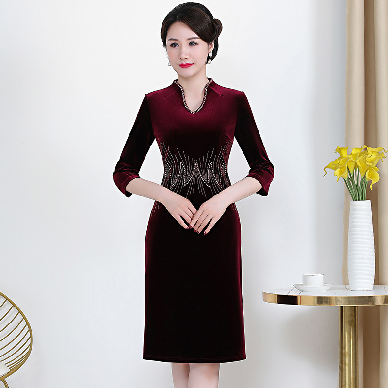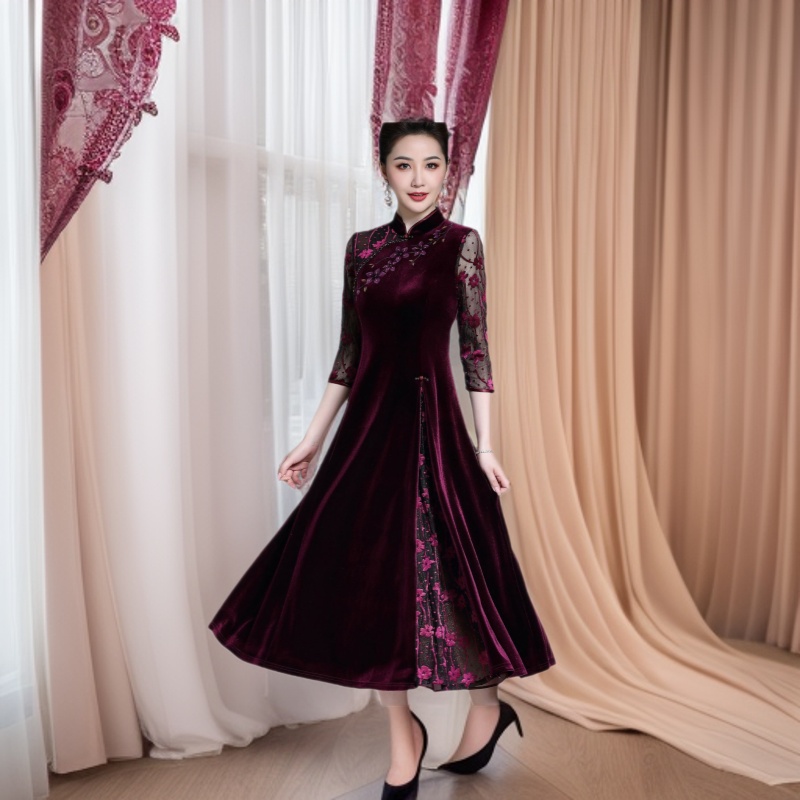Gaun musim semi dan musim panas kerah berdiri tipis komuter elegan pakaian wanita beludru emas pakaian ibu