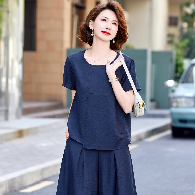 Kaus Pakaian Wanita Paruh Baya dan Usia Lanjut dengan Kerah Bulat Modis Tipe Longgar Terlihat Langsing Musim Panas Longgar Ibu Pakaian Set Musim Panas Gaya Barat