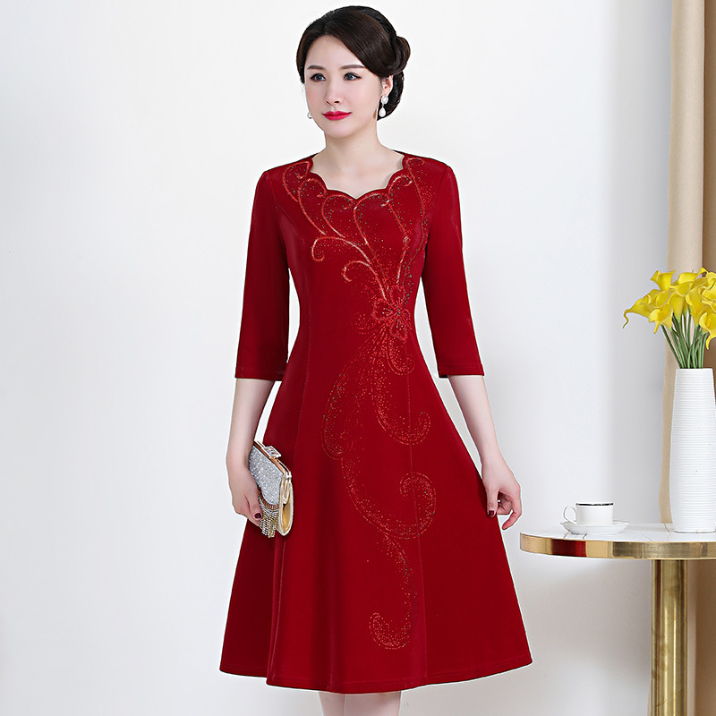 2021 musim gugur baru pakaian wanita paruh baya bermanik berlian imitasi sutra mutiara pakaian elegan pernikahan perjamuan ibu pakaian pengiriman satu potong