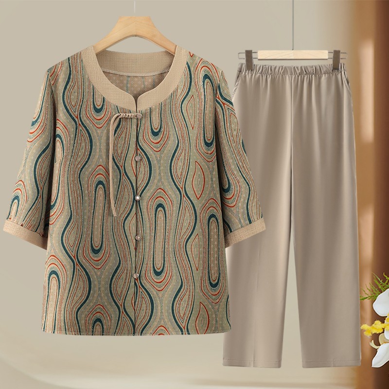 Pakaian Ibu Setelan Lengan Pendek Setengah Baya dan Tua Model Baru Musim Panas Atasan Membentuk Pinggang Setelan 100 Pagoda Kasual Modis