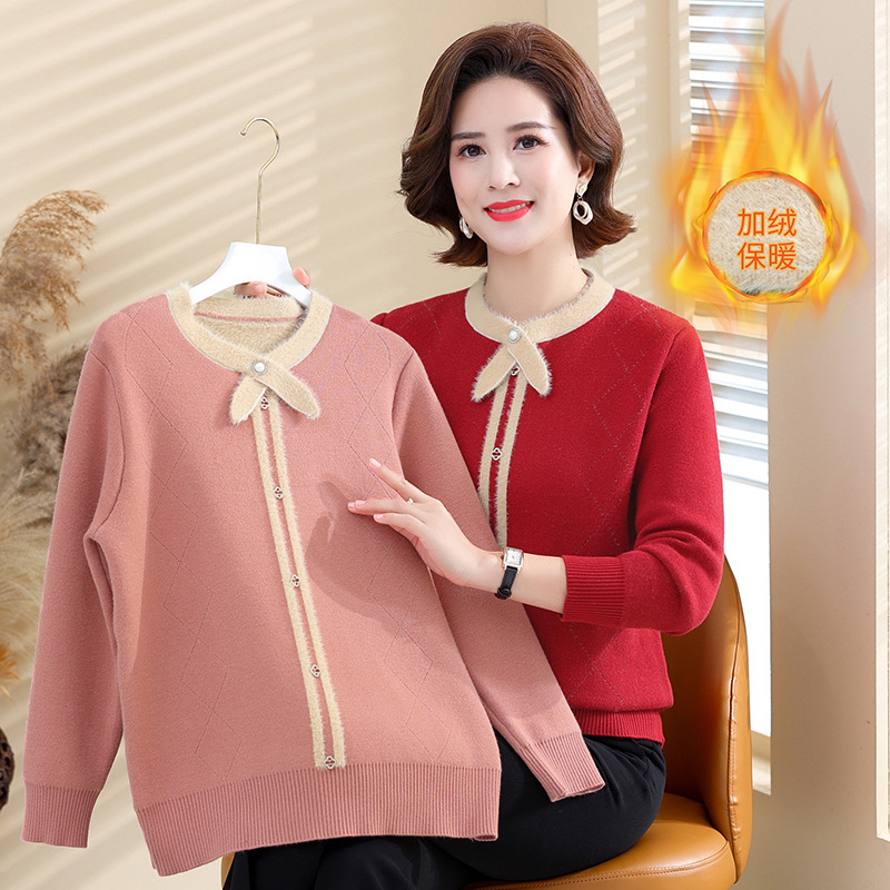 Baju sweter rajut berlapis bulu, baju sweater tebal musim gugur dan musim dingin, baju wanita usia sedang dan orang tua 40 tahun 50 hangat