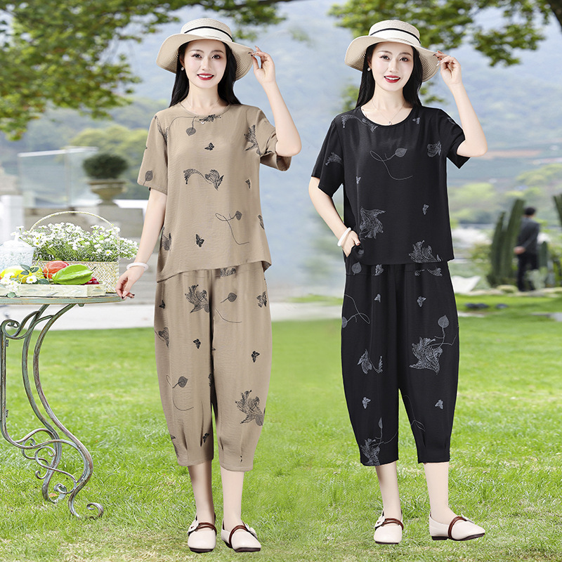 Setelan Ibu Sutra Es Setengah Baya dan Setengah Baya Celana Pendek Lengan Pendek Model Tipis Musim Panas Dua Potong Pakaian Rumah Tangga Santai Longgar Setengah Baya dan Tua