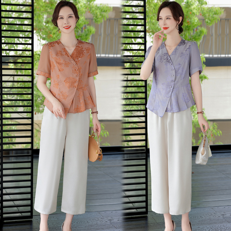 Pakaian Musim Panas Ibu T-Shirt Sutra Murbei Gaya Nasional Setelan 25 Set Dua Potong Kaki Lebar Sutra Wanita Setengah Baya dan Setengah Baya Model Baru