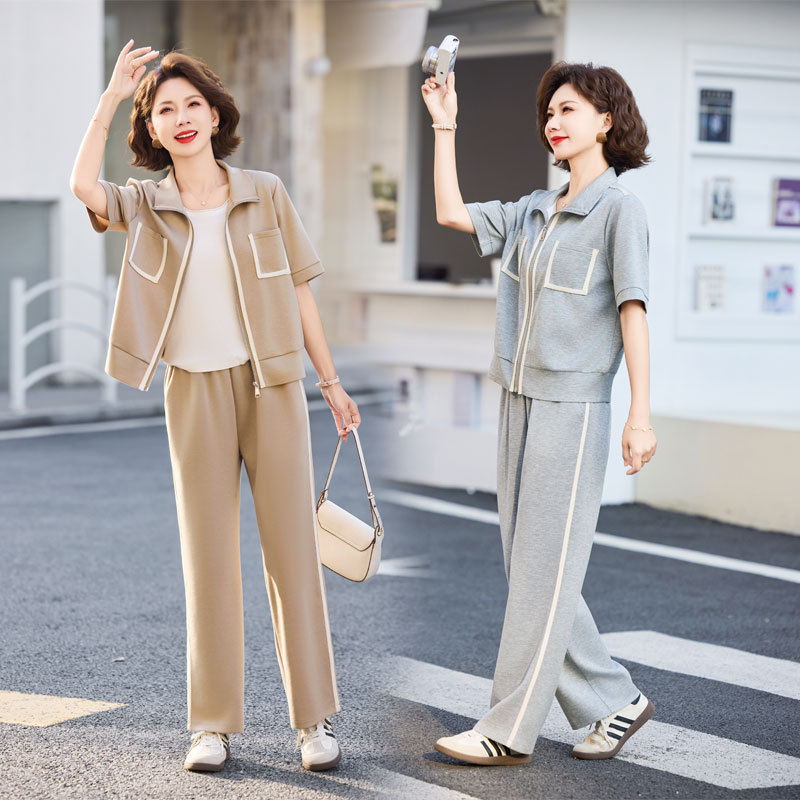 Pakaian olahraga kasual untuk ibu, pakaian luar wanita paruh baya, pakaian musim gugur, pakaian wanita paruh baya dan lansia, pakaian gaya Barat dua potong