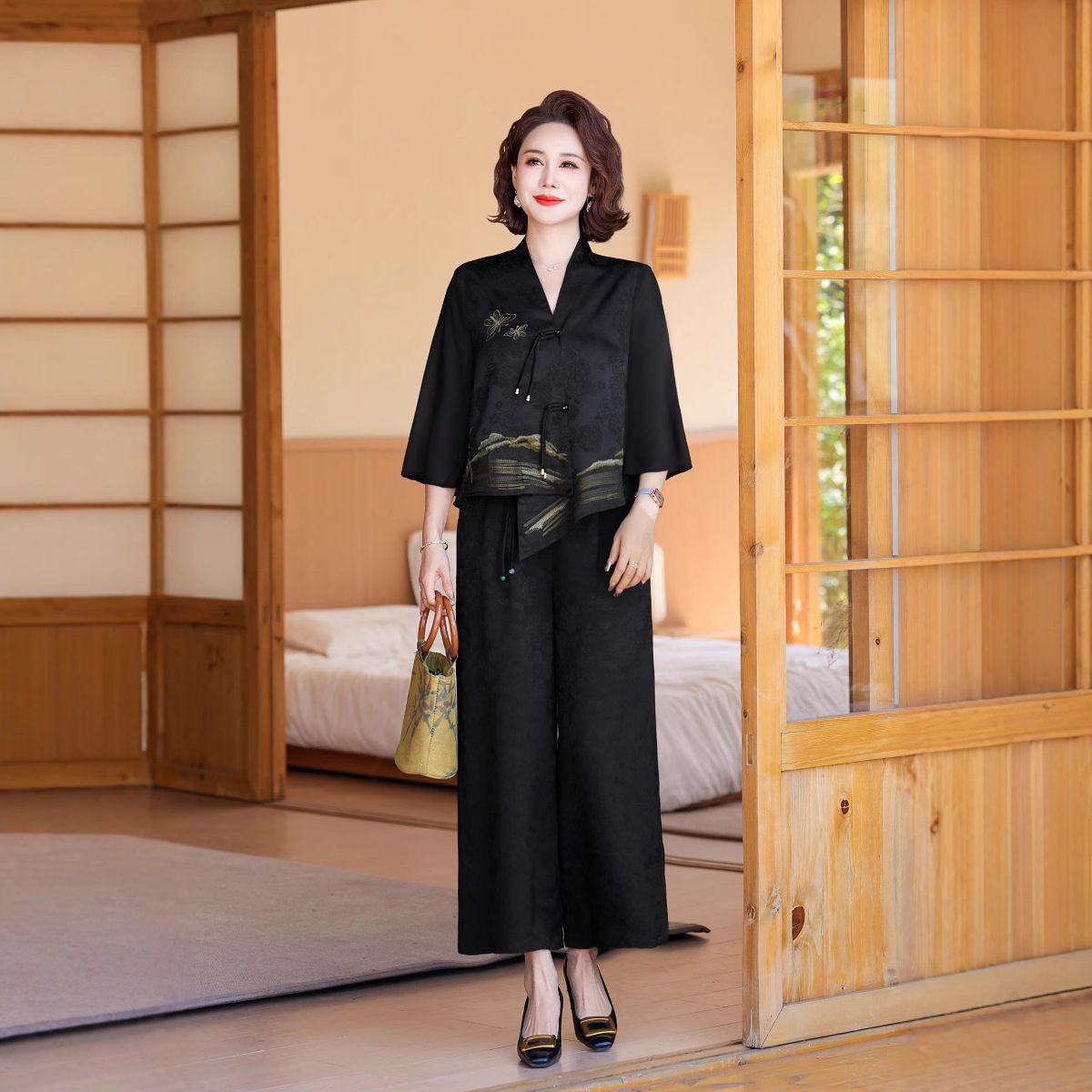 2025 Pakaian Ibu Paruh Baya Gaya Tiongkok Baru Setelan Kasa Sutra Asli Dua Set Celana Harem Sutra Murbei Berkualitas Tinggi