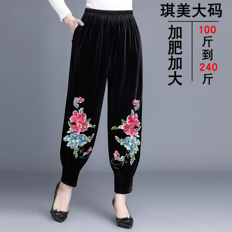 200 jin wanita paruh baya dan lansia, celana panjang ketat Ibu ukuran plus longgar musim semi dan musim gugur, celana Bloomer beludru bordir gaya etnik