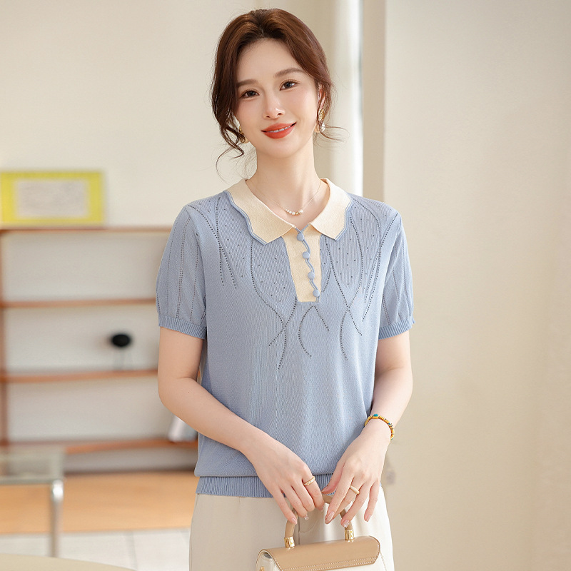 Pakaian Musim Panas Ibu Kemeja Rajutan Sutra Es Model Baru Atasan Lengan Pendek T-Shirt Modis Wanita Paruh Baya dan Tua Musim Semi Musim Panas Bertatahkan Berlian