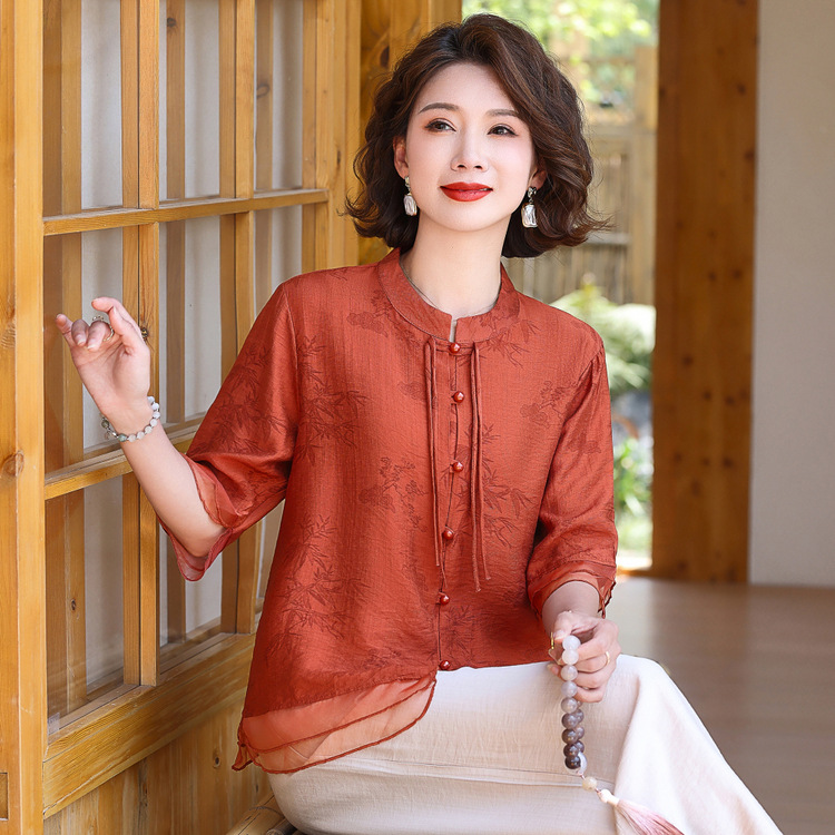 Pakaian Musim Panas Ibu Setengah Baya Kemeja Lengan Pendek Wanita Gaya China Atasan Kaus Kecil Gaya Barat Modis Kardigan Longgar Ukuran Besar