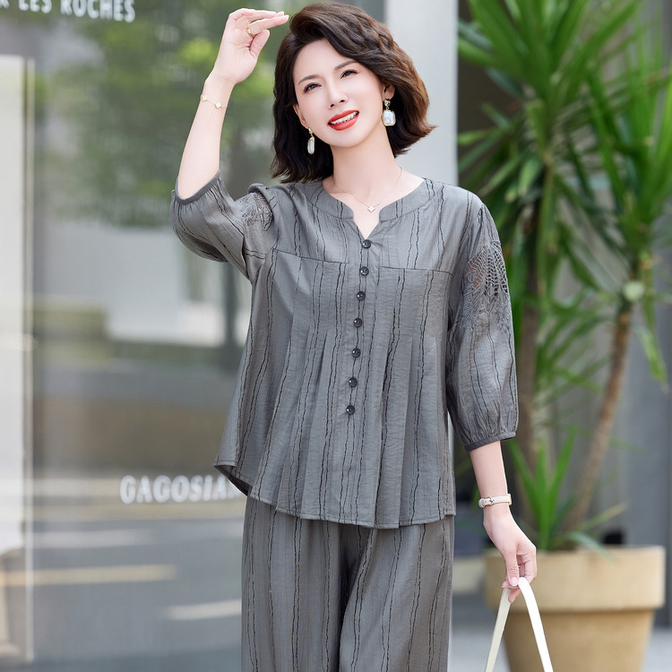Atasan Lengan Pendek Set Dua Potong Pakaian Musim Panas Ibu Setengah Baya Kemeja Lengan Pendek Set Dua Potong Gaya Barat