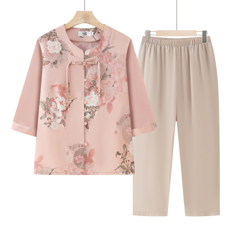 Pakaian Musim Panas Ibu Setelan Kaus Wanita Setengah Baya dan Tua Setelan Kaus Nenek Baju Atasan Ibu mertua Musim Panas Gaya Tiongkok Lengan Pendek
